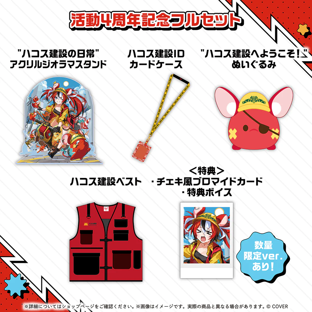 ハコス建設」をテーマにした統一デザインで、直筆サイン or 複製サインのブロマイド+日英ボイスが目玉。ぬいぐるみのヘルメット監修や、犬乃ぴすけ氏の描き下ろしなど、ファンコレクションとしての完成度が高い一式です。数量限定ver.狙いなら早めの注文推奨。