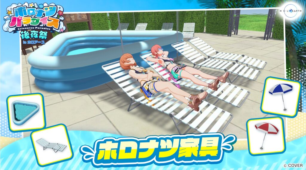 部屋を夏仕様に彩れる家具が追加。ビニールプール、ビーチチェア、ビーチパラソル(赤/青)など、イベントの雰囲気に合うアイテムが揃います。