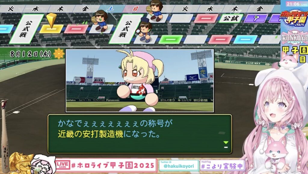 白銀ノエル(ミ91/パ90、チャンス系多数)が高確率で適時打。わため(AH)とラミィが前後で好機創出と勝負強さを補完。外野陣(そら・アーニャ・オリー)の高走力で長打を単打二本分に変換する。