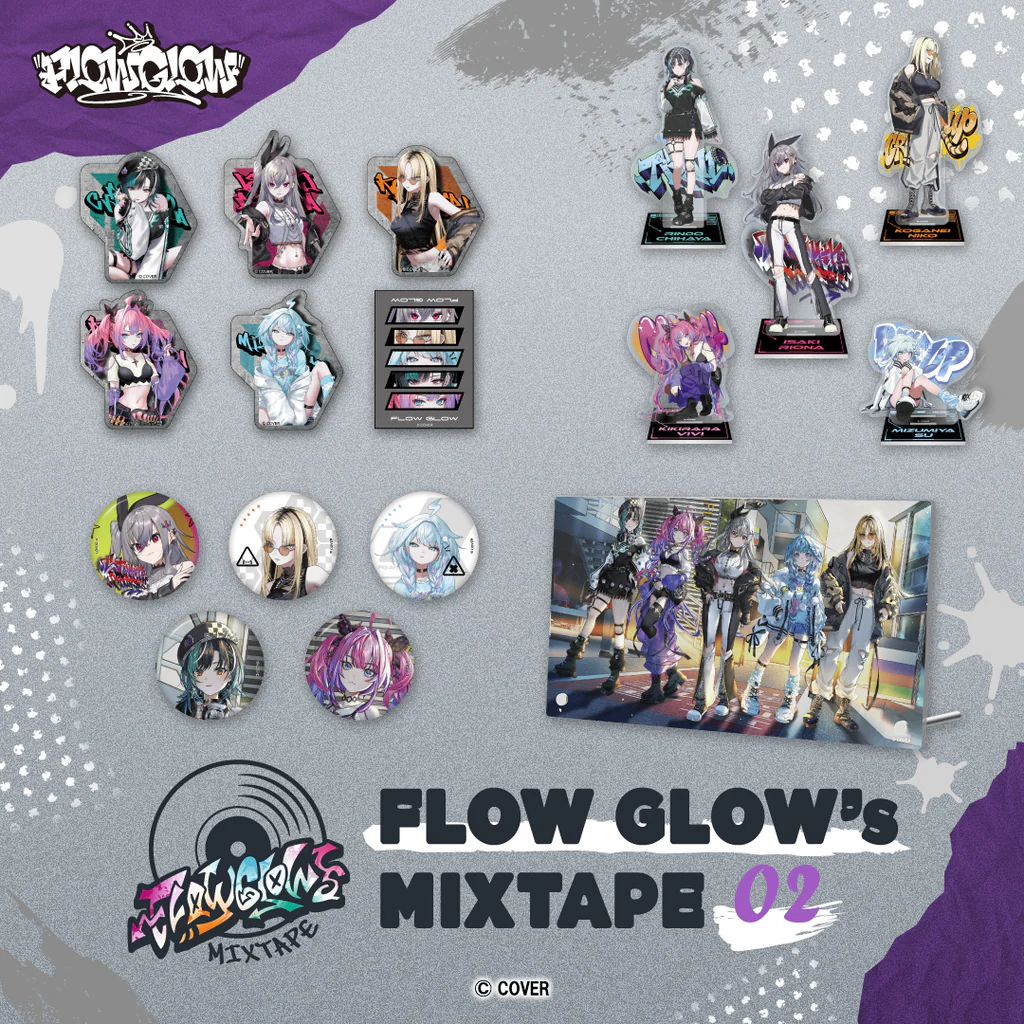 hololive DEV_ISの音楽アーティストグループFLOW GLOWのグッズシリーズ第2弾「FLOW GLOW’s MIXTAPE 02」が公式ショップに登場。ステッカー・アクスタ・缶バッジ・アクリルパネルの定番アイテムを、価格や仕様とあわせて整理しました。